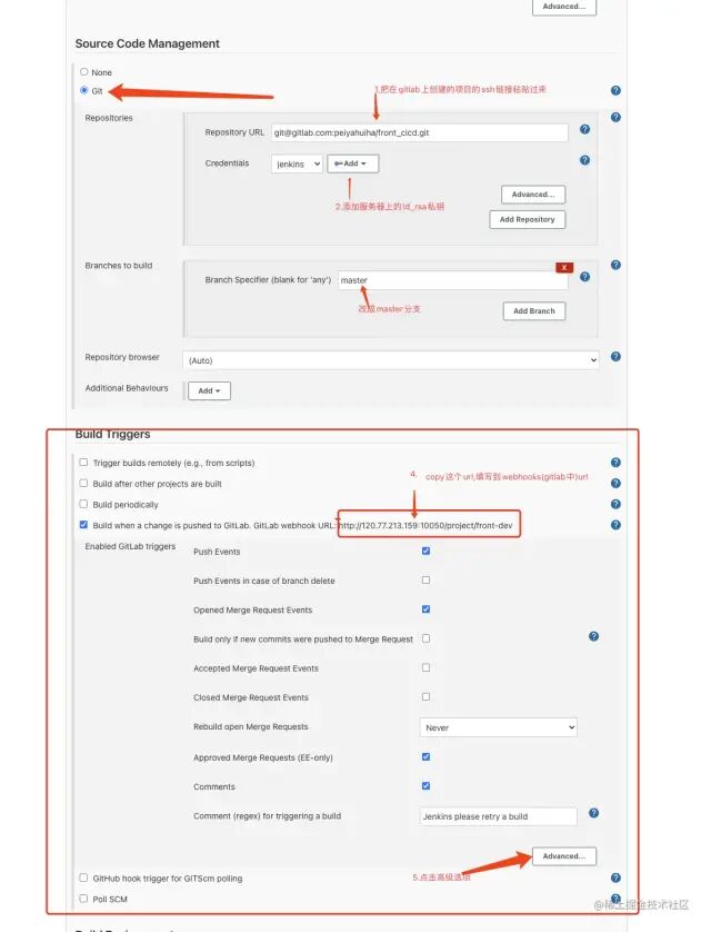 前提: 你需要自行安装 jenkins 插件 (ssh,gitlab,build parms 插件)