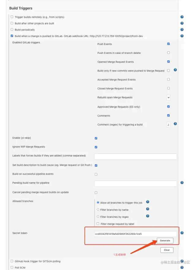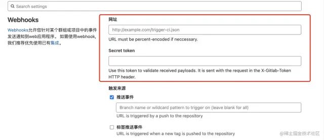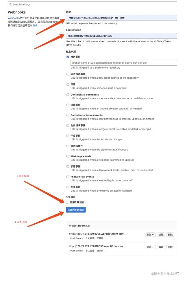 (7) 还记得配置 gitlab 的时候么, 还有 url 和秘钥没有配置, 现在把刚才 copy 的 url 和秘钥复制到 webhooks 当中