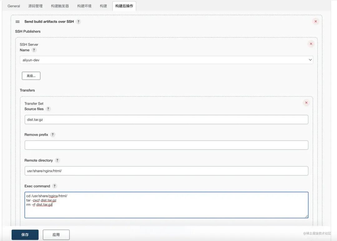 Rransfer Set Source files:要上传到目标服务器的文件。它是一个相对路径,相对于 Jenkins 的工作目录 由于上面的 shell 执行之后在工作目录中只有一个压缩包,so 直接写一个文件名即可。Remove prefix:去前缀。假设此时打包文件在/var/lib/jenkins/workspace/web-deploy/assets/dist.tar.gz,那么Rransfer Set Source files则应该为assets/dist.tar.gz,此时Remove prefix配置为assets/则可以去除这个前缀,否则会在目标服务中创建assets。Remote directory:远程的静态资源托管目录。由于配置服务器默认为/,所以usr/share/nginx/html/不用以/开头。Exec command:远程机执行shell,由于配置服务器默认为/, 所以 工作目录也是以/开始。