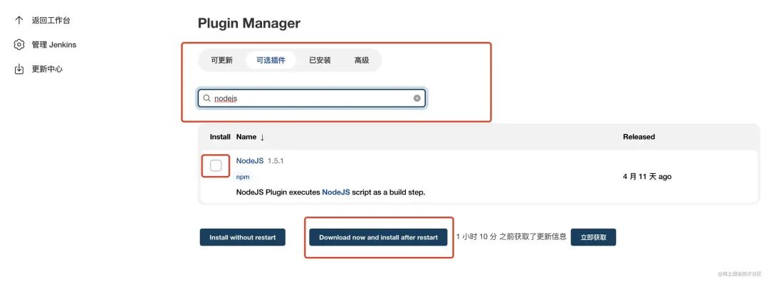 接着来到 Jenkins 这里。想要部署前端项目还需要依赖一个 Node 环境,需要在 Manage Jenkins -> Manage Plugins 在可选插件中搜索 nodejs 选择对应插件进行安装,安装完成后需要重启才会生效。