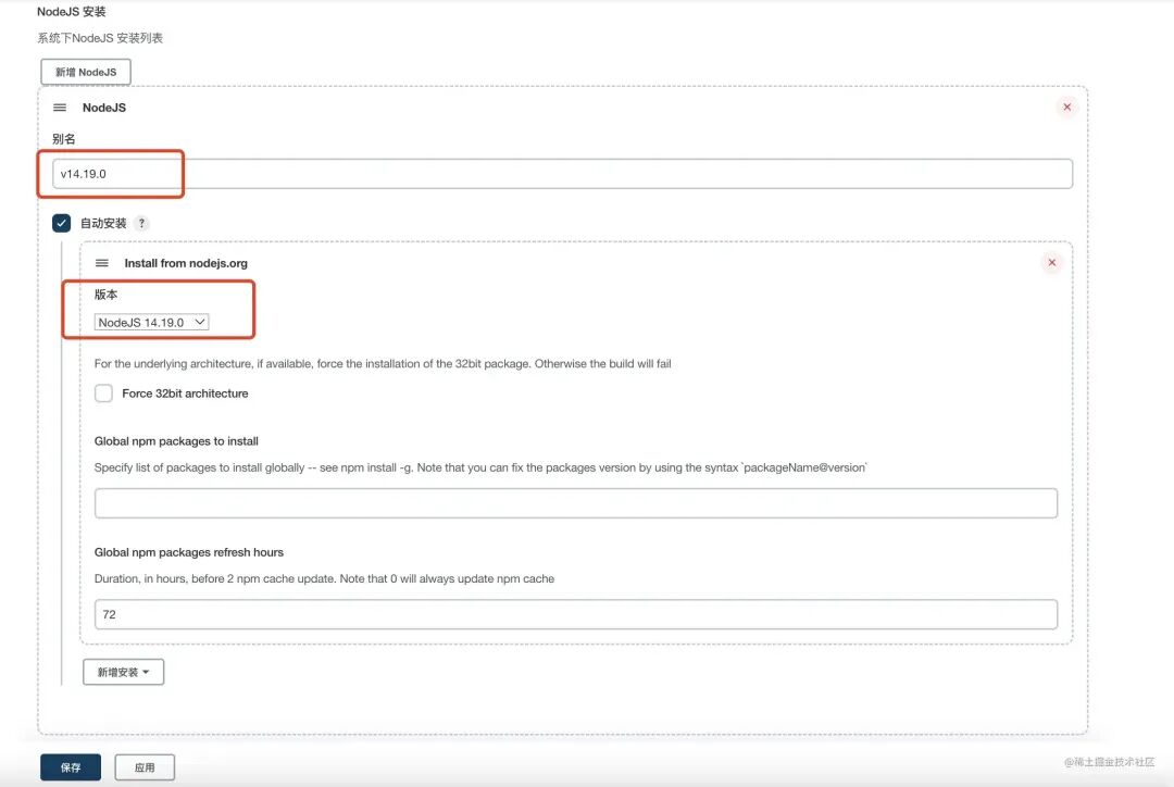 然后到 系统管理 -> 全局工具配置 中配置 Node (吐槽:没有安装任何插件时系统管理以及其子页面全是英文,安装完插件后又变成了中文。这国际化不知道是系统原因还是它的原因 😂)。