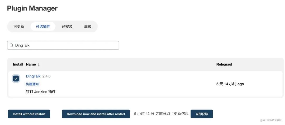 1,系统管理 -> 插件管理 搜索 DingTalk 进行安装。文档 [5]