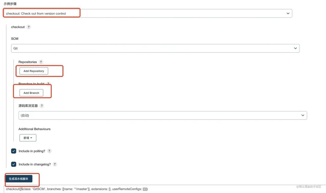 2,如果不是为了侦听 github push 选择 git: Git 即可,但现在应该选择 checkout: Check out from version control,随后填写信息生成代码即可。