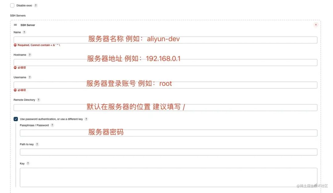 2,然后在系统管理 -> 系统配置中找到 Publish over SSH 点击新增,再点击高级,然后选中 Use password authentication, or use a different key