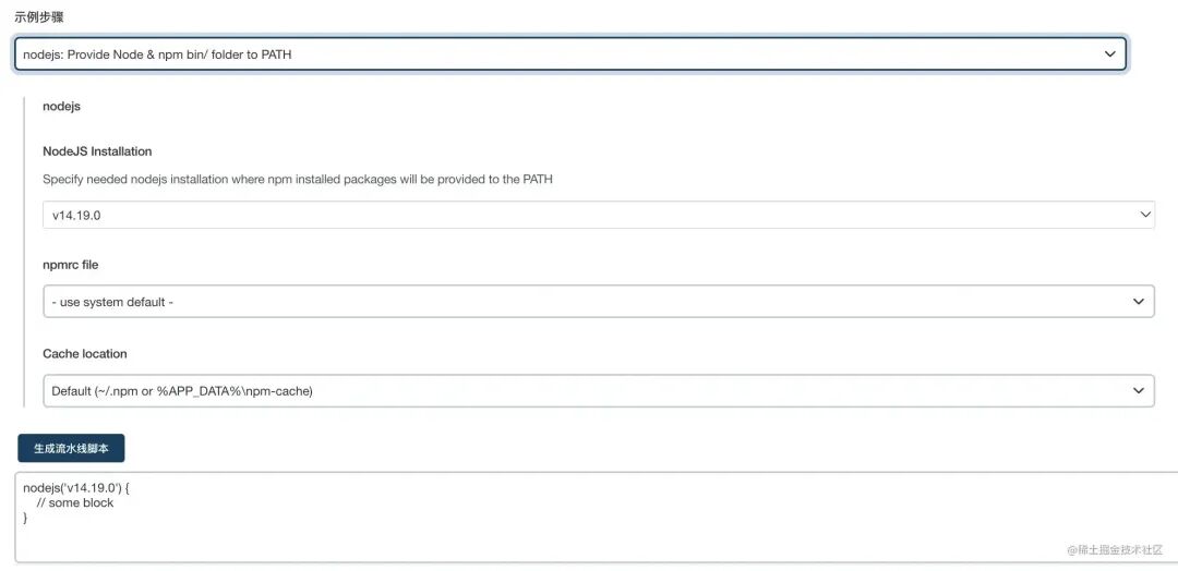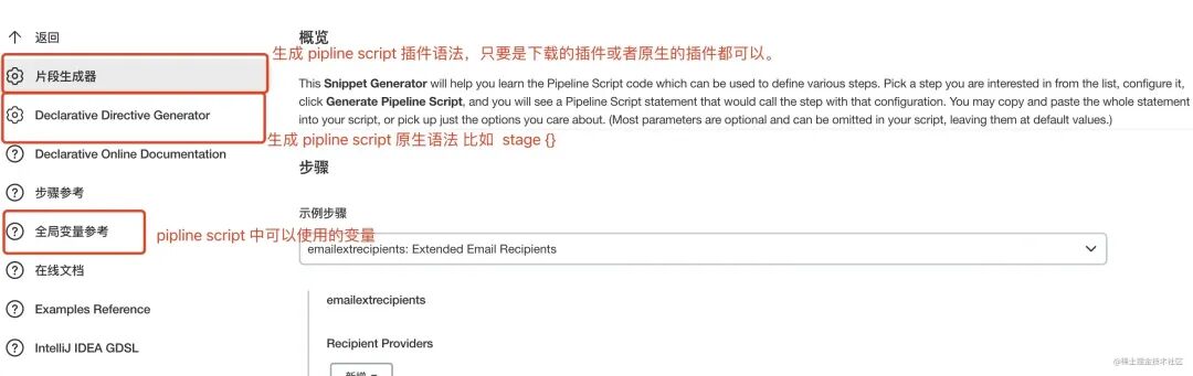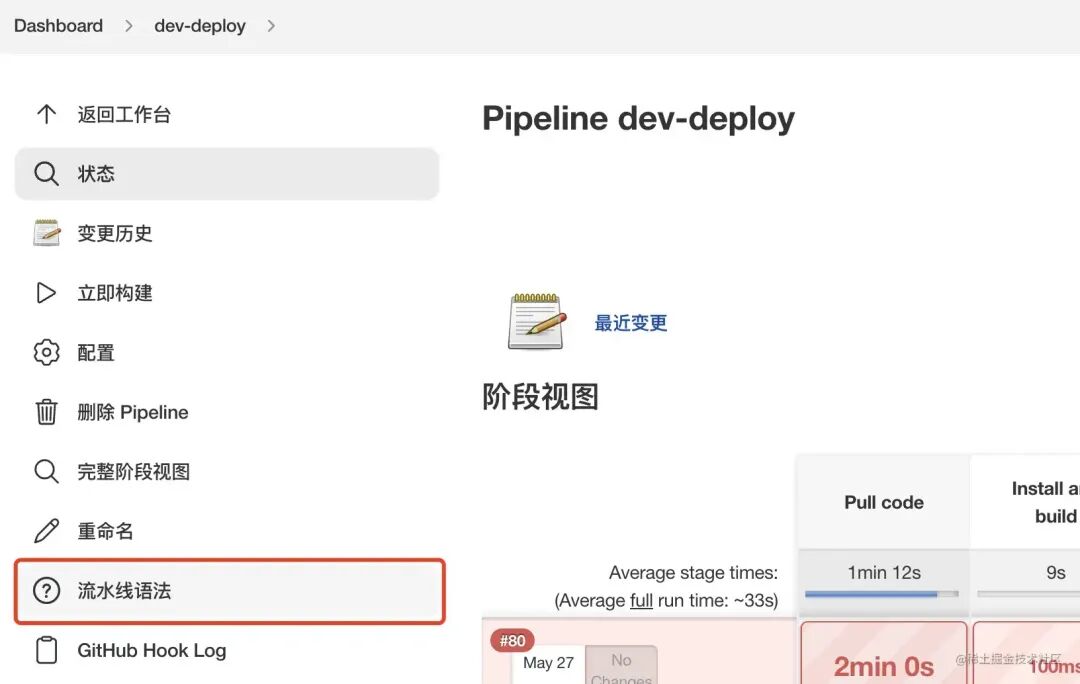// 自定义 钉钉插件 的 错误信息和成功信息def successText = [ """ ### 新的构建信息,请注意查收""", """ ${env.JOB_BASE_NAME}任务构建<font color=green>成功</font> ,点击查看[构建任务 #${env.BUILD_NUMBER}](http://106.14.185.47:8080/job/${env.JOB_BASE_NAME}/${env.BUILD_NUMBER}/)"""]def failureText = [ """ ### 新的构建信息,请注意查收""", """ ${env.JOB_BASE_NAME}任务构建<font color=red>失败</font> ,点击查看[构建任务 #${env.BUILD_NUMBER}](http://106.14.185.47:8080/job/${env.JOB_BASE_NAME}/${env.BUILD_NUMBER}/)"""]// 1,侦听 github push 事件properties([pipelineTriggers([githubPush()])])pipeline { agent any // 环境变量定义。 environment { GIT_REPO = 'http://github.com/vue-ts-vite-temp.git' } stages { // 2,拉取 github 代码,通过 GitSCM 侦听 push 事件。 stage('Pull code') { steps { checkout( [ $class: 'GitSCM', branches: [[name: '*/main']], extensions: [], userRemoteConfigs: [ [ credentialsId: '381325e4-0f9c-41ea-b5f6-02f8ea2a475a', url: env.GIT_REPO ] ], changelog: true, poll: true, ] ) } } stage('Install and build') { steps { // 3,前面安装过的 nodejs 插件使用 nodejs('v14.19.0') { sh 'npm install yarn -g' sh 'yarn install' sh 'yarn build' } } } stage('Pack') { steps { sh 'tar -zcvf dist.tar.gz dist/' sh 'rm -rf dist/' } } stage('Deploy') { steps { // 4,前面下载的 Publish Over SSH 插件的使用 sshPublisher( publishers: [ sshPublisherDesc( configName: 'aliyun-dev', transfers: [ sshTransfer( cleanRemote: false, excludes: '', execCommand: ''' cd /usr/share/nginx/html/ tar -zxvf dist.tar.gz rm -rf dist.tar.gz ''', execTimeout: 120000, flatten: false, makeEmptyDirs: false, noDefaultExcludes: false, patternSeparator: '[, ]+', remoteDirectory: '/usr/share/nginx/html/', remoteDirectorySDF: false, removePrefix: '', sourceFiles: 'dist.tar.gz' ) ], usePromotionTimestamp: false, useWorkspaceInPromotion: false, verbose: false ) ] ) } } } post { success { // 5,DingTalk 插件的使用。 dingtalk ( robot: '1314', type: 'ACTION_CARD', title: 'Jenkins构建提醒', text: successText, btns: [ [ title: '控制台', actionUrl: 'http://106.14.185.11:8080/' ], [ title: '项目预览', actionUrl: 'http://github.com/' ], ], at: [] ) } failure { dingtalk( robot: '1314', type: 'ACTION_CARD', title: 'Jenkins构建提醒', text: failureText, btns: [ [ title: '控制台', actionUrl: 'http://106.14.185.11:8080/' ], [ title: '项目预览', actionUrl: 'http://github.com/' ], ], at: []// 这里是手机号多个之间,隔开 ) } }}复制代码这么多内容手写无疑是很难受的,好在 Jenkins 提供了一些帮助工具。访问地址为:Jenkins地址 + /job + 当前任务 + /pipeline-syntax/,例如:http://localhost:8080/job/dev-deploy/pipeline-syntax/,或者进入任务构建页面,点击流水线语法进入