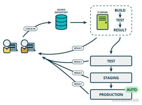 从前端的角度考虑,在某些情况下肯定是不能直接通过自动化的方式将最终的 build 结果直接扔到生产机的。持续交互就是可持续性交付供生产使用的的最终 build。最后通过运维或者后端小伙伴进行部署。