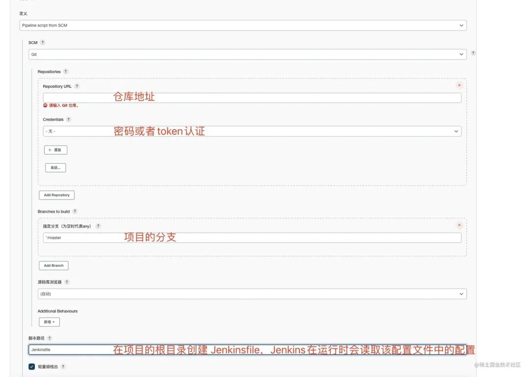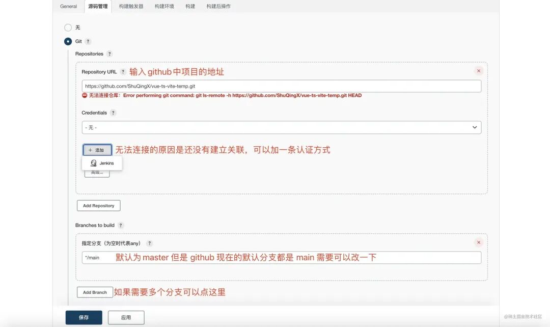在 源码管理 处选择 git ,输入仓库地址,点击添加。