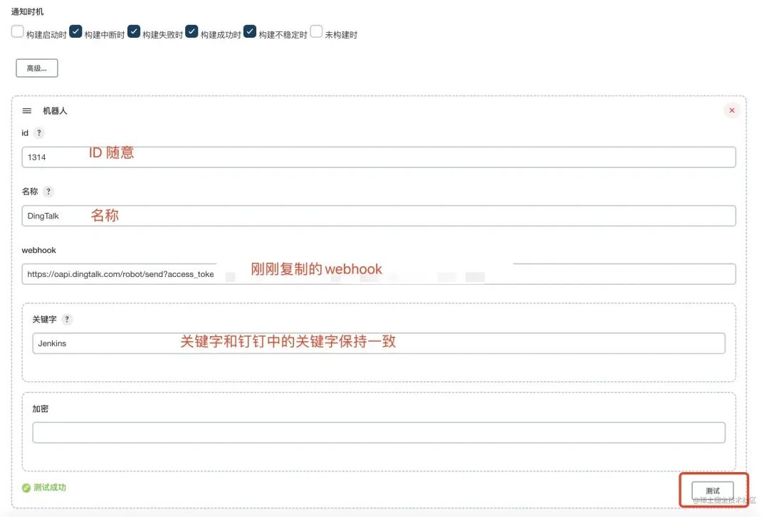 4,Jenkins 中 系统管理 -> 系统配置 -> 钉钉 -> 新增 配置完成后可点击右下角进行测试。