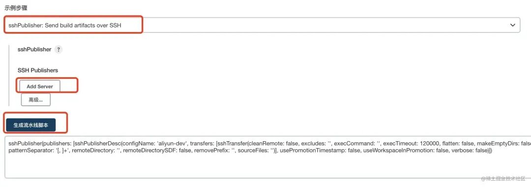 4,选择 sshPublisher: Send build artifacts over SSH,像上面流水线一样配置之后直接生成代码即可。