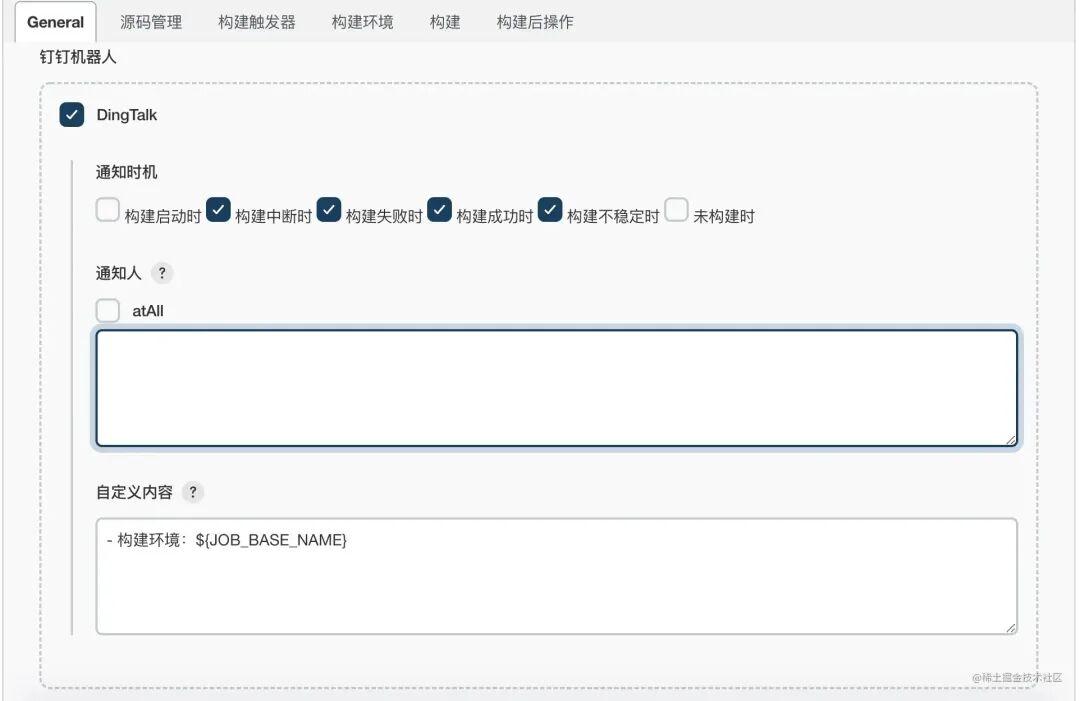 SSH: Connecting from host [iZuf6dwyzch3wm3imzxgqfZ]SSH: Connecting with configuration [aliyun-dev] ...SSH: EXEC: completed after 202 msSSH: Disconnecting configuration [aliyun-dev] ...# 如果 Transferred 0 file 则需要查看配置的路径是否正确。表示文件并没有被移动到远程主机中。SSH: Transferred 1 file(s)Finished: SUCCESS复制代码构建目标:钉钉机器人通知