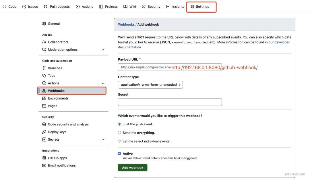 github需要集成的项目中添加webhook。在Payload URL中将上述内容填入。