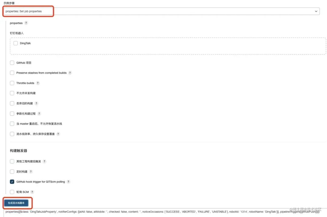 1,在片段生成器中选择 properties: Set job properties 生成代码片段。由于只是使用了 git hook trigger 所以要对生成的片段稍作修改。