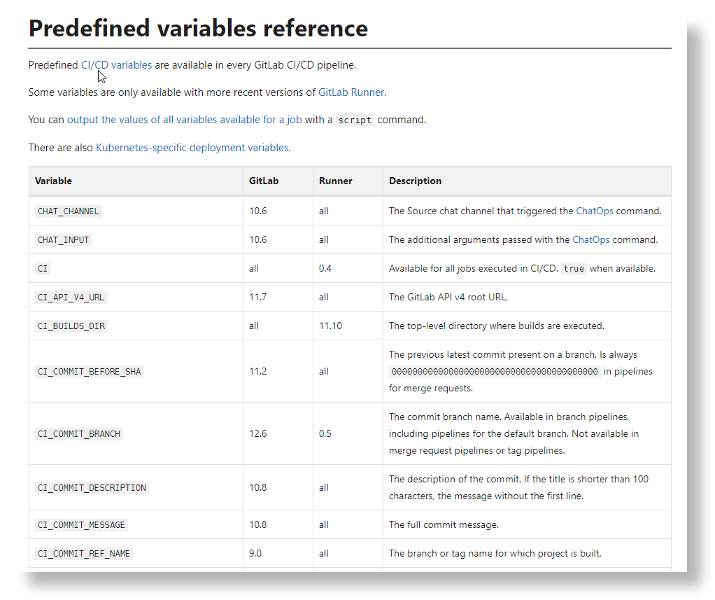 Gitlab 通过 Variables 为 CI/CD 提供了更多配置化的能力,方便我们快速取得一些关键信息,用来做流程决策。上述示例中的$CI_COMMIT_REF_NAME和$CI_PROJECT_DIR就是 Gitlab 的预定义变量。