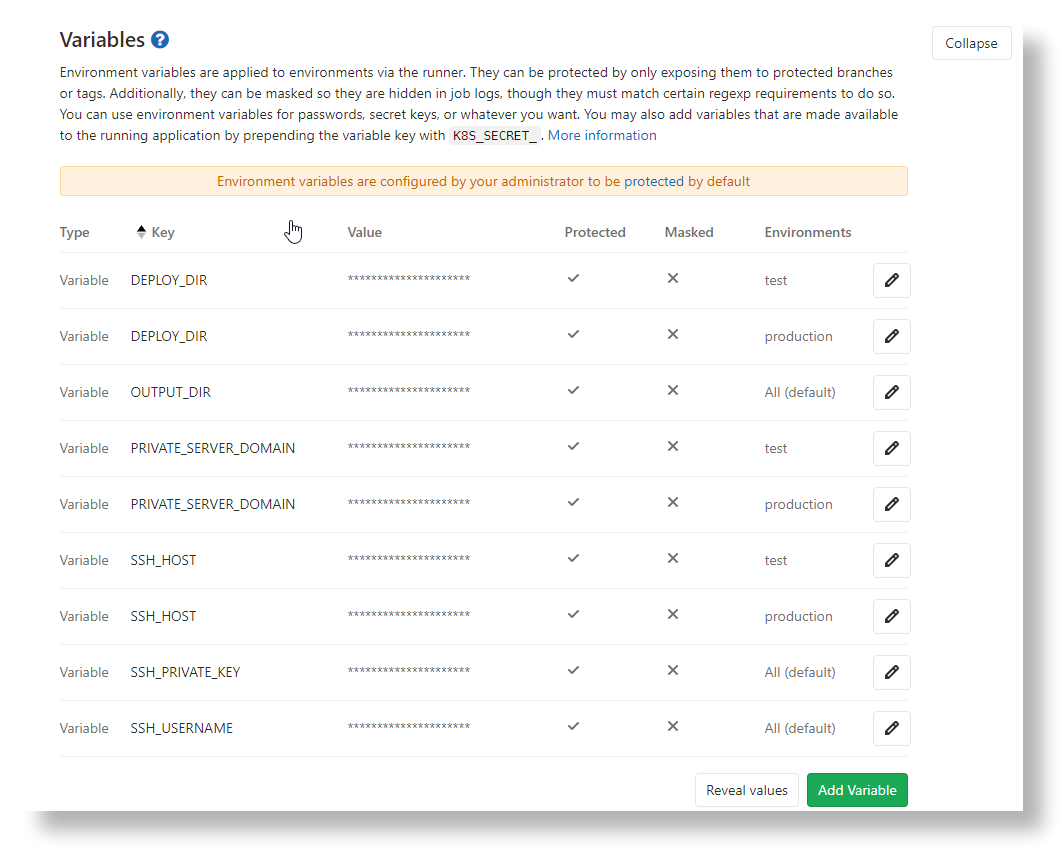 除了预定义变量,我们也可以自行定义一些环境变量,比如服务器 ip,用户名等等,这样就免去了在配置文件中明文列出私密信息的风险;另一方面也方便后期快速调整配置,避免直接修改.gitlab-ci.yml。