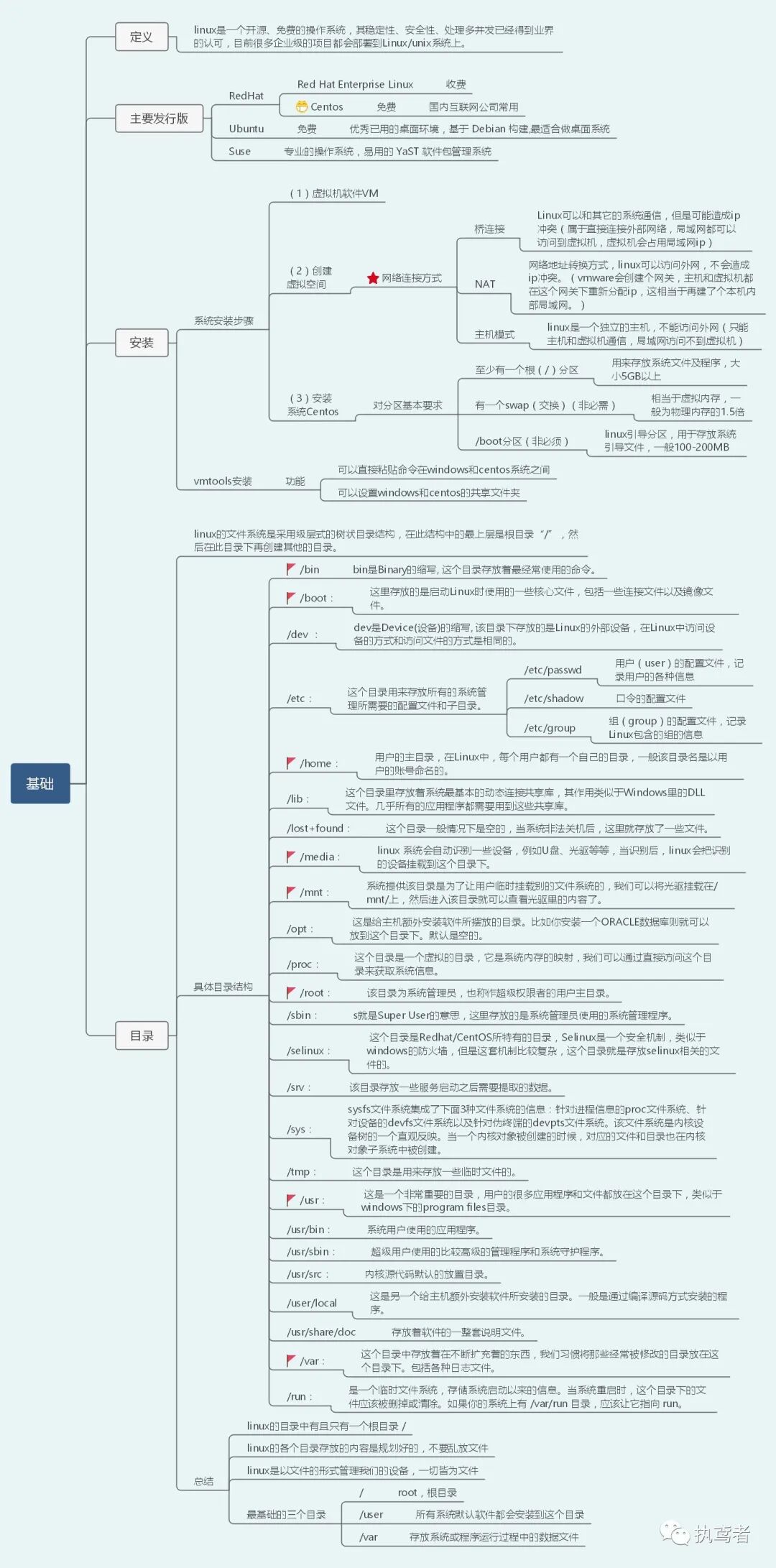 本文主要是 Linux 的入门内容,利用 40 张思维导图从基础、操作、实用指令、组管理和权限管理、crond 任务调度、Linux 磁盘分区和挂载、Linux 网络环境配置、进程管理、服务管理、RPM 和 YUM、软件安装关键点、Shell 编程共十二部分着手,从而系统的了解一下 Linux(基于 Centos),本文的定位是前端工程师够用、运维工程师入门。