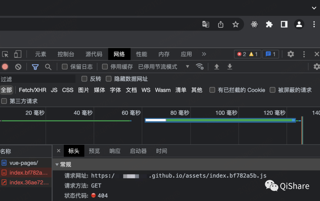 Setting->Pages, 稍等一会儿,下面出现了一个网址, 这就是项目线上地址遇到问题点击查看网址,并没有像我们预期的那样展示页面,而是一片空白。打开调试版查看错误信息: