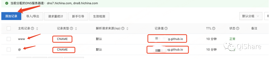 这里以阿里云为例,打开域名解析控制台,点击解析按钮点击添加记录按钮,将下面两种类型的记录值添加上,记录类型是: