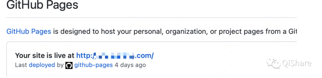 返回到项目的GitHub pages设置页面,将我们购买的域名添加在Custom domain中,点击save,可以看到pages的地址变成了我们自己的域名,访问它就会看到你的网站了.