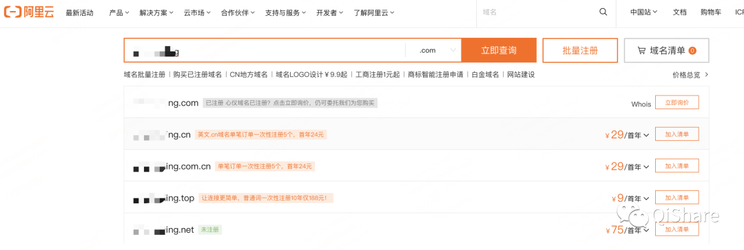 如果想将项目地址改成自己的专属域名,首先需要你去购买一个域名,目前阿里云, 腾讯云都支持域名的购买,搜索自己喜欢的域名直接付款就好了。