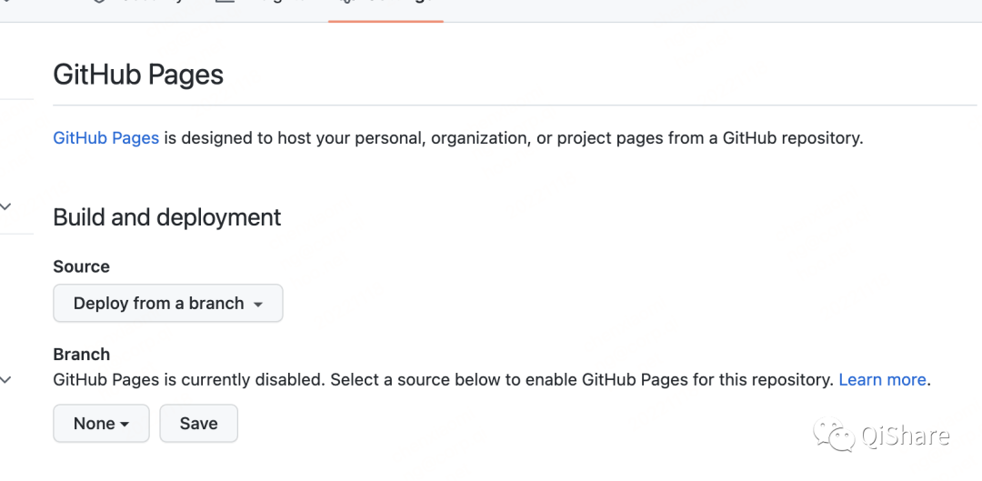 GitHub Actions**回到GitHub, 点击Setting->Pages,看到如下界面并没有展示网址,别急!此时还需要我们去新建一个名为 gh-pages 的分支,创建完成后再次打开