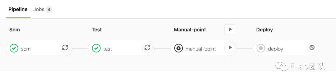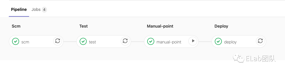 stages: - scm - test - manual-point - deployscm: stage: scm script: - scripts/build.shtest: stage: test script: - scripts/test.shmanual-point: stage: manual-point script: - echo I am manual job only: - master when: manual allow_failure: falsedeploy: stage: deploy script: - scripts/deploy.sh only: - master触发 pipeline 后,我们可以看到,经过了 scm 编译、test 自动化测试的步骤后,到了 Manual-point 卡点,此时流水线已经锁定执行,需要人工手动点击确认才可以继续执行;