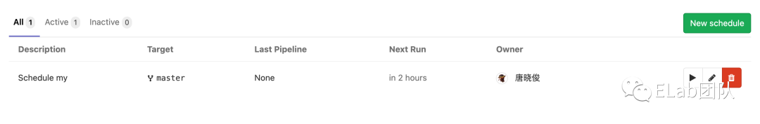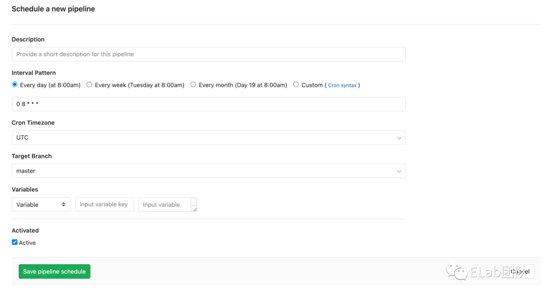 有些场景我们想定时地执行 Pipeline,而不是通过事件触发,可以在 GitLab -> Setting -> Schedule 进行设置