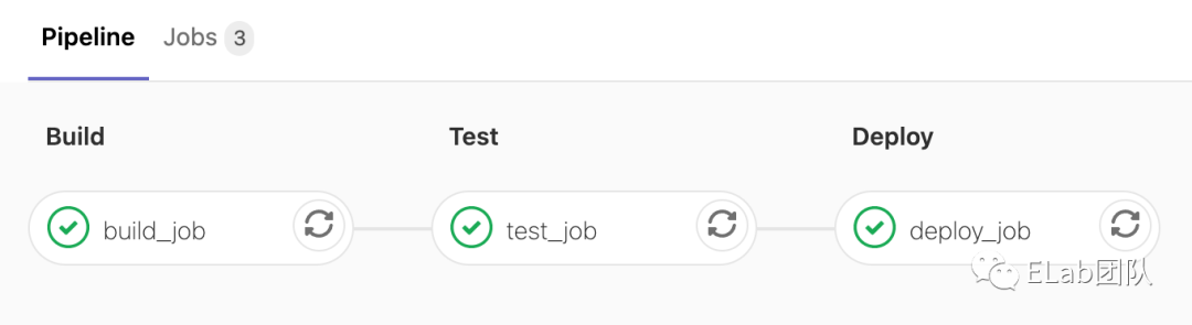 Pipeline 可以包含若干 Stage,而每个 Stage 又可以指定执行若干 job,这样我们就可以把整个构建的流程串起来了。如下,我们就可以在 GitLab 的 pipeline 中看到这些 Stages,及其对应的 job: