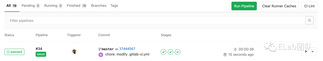 如下图,我们可以在 GitLab -> CI/CD -> Pipeline 中看到: