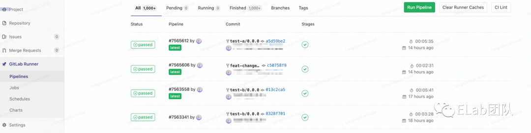 当有了以上的准备,我们配置好 .gitlab-ci.yml 文件、写好对应的脚本,同时配置好 GitLab-runner 后,就可以开启并体验 CI 流水线了。当提交代码后(当然也可以按上述的 only 关键字设置为打 tag、提 mr 时触发),就可以触发 GitLab CI 的 Pipeline,并执行对应的 stages 及其 jobs 啦 🎉