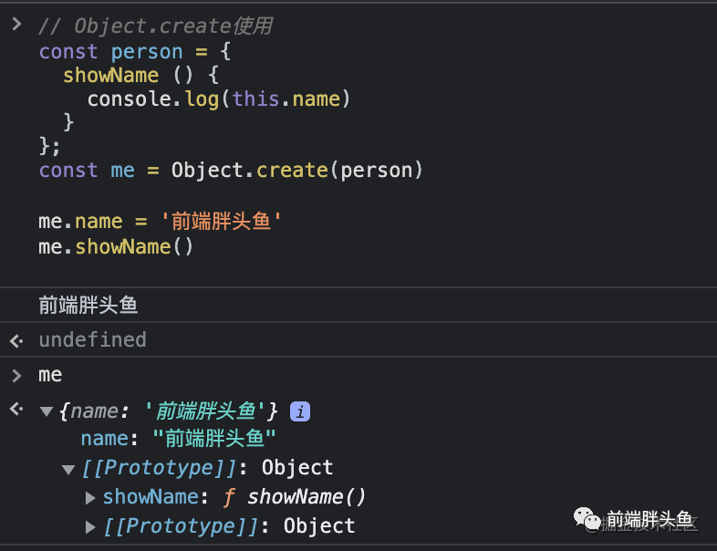 // Object.create使用const person = { showName () { console.log(this.name) }}const me = Object.create(person)me.name = '前端胖头鱼' me.showName() // 前端胖头鱼可以看到person作为me实例的原型存在, 原型上有showName方法