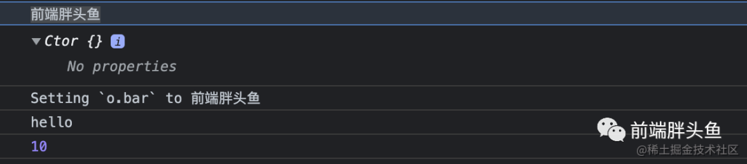 let o = Object.create(Object.prototype, { // foo会成为所创建对象的数据属性 foo: { writable:true, // 可以修改 configurable:true, // 可以配置 enumerable: true, // 可以遍历 value: "hello" }, // bar会成为所创建对象的访问器属性 bar: { configurable: false, get: function() { return 10 }, set: function(value) { console.log("Setting `o.bar` to", value); } }})// 无法进行修改o.bar = '前端胖头鱼'console.log(o.foo) // helloconsole.log(o.bar) // 10// 遍历测试for (let key in o) { console.log(key, o[key]) // foo hello}「代码实现」