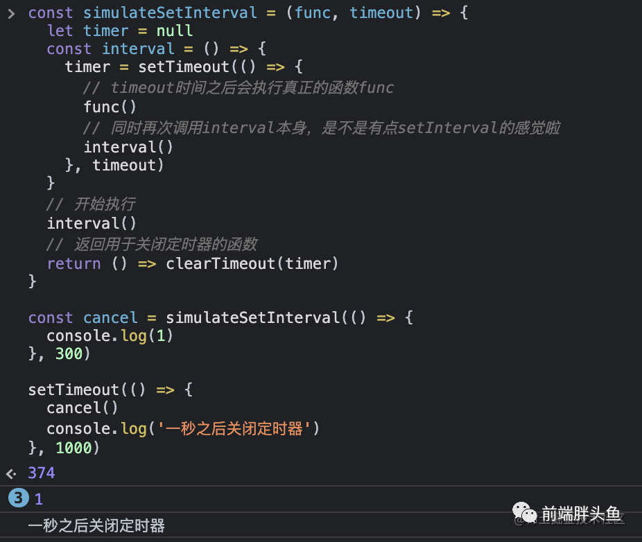 const simulateSetInterval = (func, timeout) => { let timer = null const interval = () => { timer = setTimeout(() => { // timeout时间之后会执行真正的函数func func() // 同时再次调用interval本身,是不是有点setInterval的感觉啦 interval() }, timeout) } // 开始执行 interval() // 返回用于关闭定时器的函数 return () => clearTimeout(timer)}const cancel = simulateSetInterval(() => { console.log(1)}, 300)setTimeout(() => { cancel() console.log('一秒之后关闭定时器')}, 1000)可以看到 1 被打印出了 3 次,第 1000 毫秒的时候定时器被关闭,1 也就没有继续打印了。
