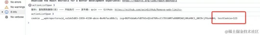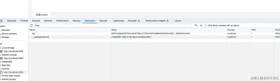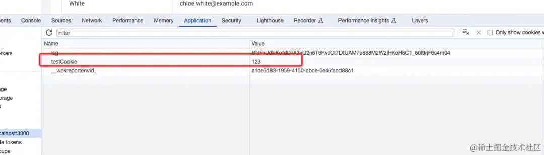操作方式同上,在 A 页面设置了 testCookie=123 但是并不会在 cookie 中马上显示要刷新才能显示