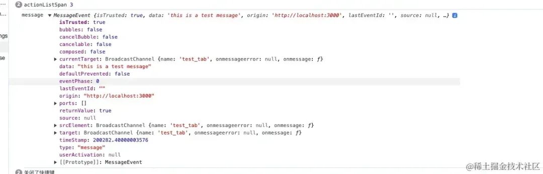 const bc = new BroadcastChannel('test_tab')bc.onmessage = (ev) => { console.log('message', ev)}结果如下: