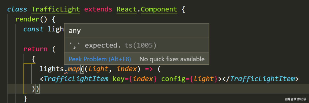 TrafficLight和TrafficLightItem,并且按照我记忆中我看过的 JSX 语法使用了 for 循环去生成多个TrafficLightItem,但这一步报错了... 一个 TS 的报错,而我明明使用的是 js...