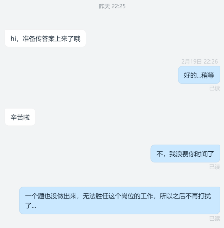 所以我想把不堪记录下来,督促自己今后学习稍多一点尽量避免这样的事故,也是想要写出来告诉和我接触的东明和绝云,不要因为个例而沮丧,请一如既往相信应聘者。