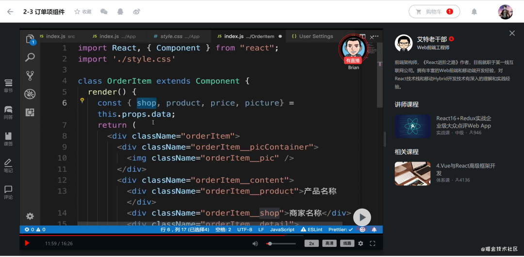 还好我记得我看过 react 使用 class 组件的视频,我不用像无头苍蝇一样去翻文档,于是我打开慕课网,找到了我历史记录中的 react 入门视频,从中我找到了我想要的 class component 的写法(借助 vscode 的一个 react snippet 的插件),并且快速浏览了我之后会用到的 props 写法。