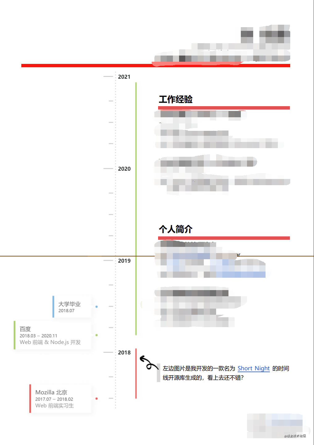 我发现其实好像没那么重要,因为面试官根本不怎么看你的简历。这是我观察到的一个非常有趣的小细节为什么这么说呢?事情是这样的我的简历里面第一页里有一个非常漂亮的时间轴,是我用 Short Night[2] 画的。这是一个我的开源项目,它在简历里大概这样:因此,我当然会在面试中的开场自我介绍里面提上一嘴,然后 70% 的面试官都会有如下反应:
