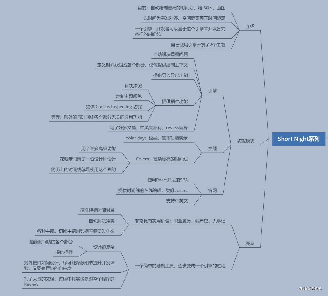 你需要对于自己的项目预先整理一份脑图这点非常重要。面试过程中光是组织言语就已经很废脑子了,如果还需要回忆几年前的项目并整理思路,那简直是噩梦。因此,预先整理你项目的大纲是一个非常重要的点比如下图是我对于我的个人开源项目 Short Night[3] 的整理:上图可以大致保证,面试官问到任何有关 Short Night 项目的问题,我都可以迅速定位到某一个模块,然后有条不紊的解释其实这个精细程度还是不太够的。上图只是我的个人开源项目之一,并非是我的关键项目。我的关键项目整理的要更为复杂,内容更为多一些