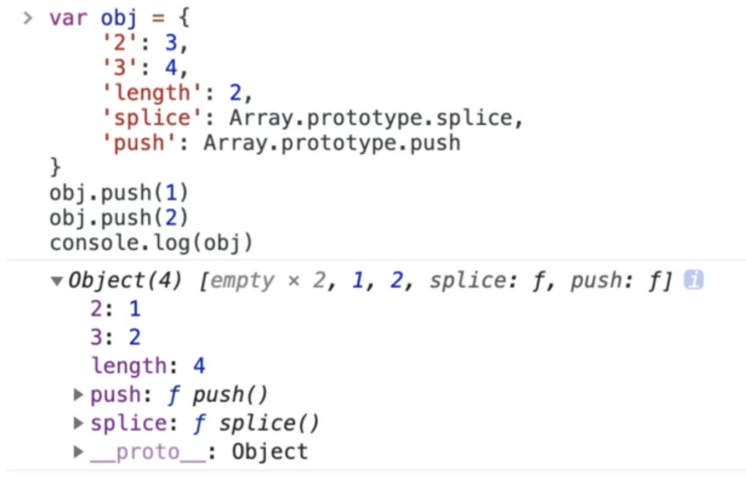 obj[2]=1;obj.length+=12. 使用第二次 push,obj 对象的 push 方法设置obj[3]=2;obj.length+=13. 使用 console.log 输出的时候,因为 obj 具有 length 属性和 splice 方法,故将其作为数组进行打印 4. 打印时因为数组未设置下标为 0 1 处的值,故打印为 empty,主动 obj[0] 获取为 undefined