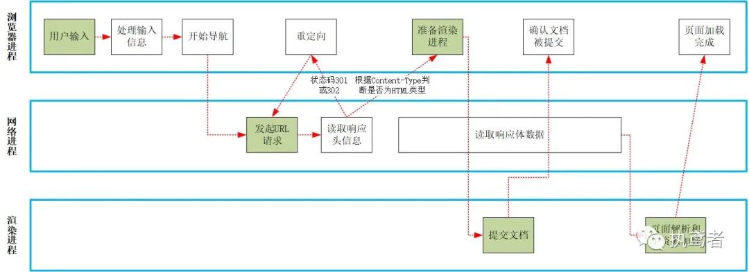 用一张图来表示整个流程,整个流程包含导航阶段和渲染阶段两大部分,其中每个具体细节所需要的进程如下图所示。