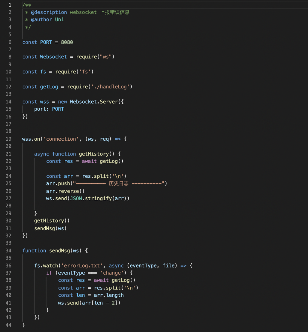 websocket 连接,并将 errorLog.txt 文件中的记录当作历史日志传给前端并倒序渲染出来。这个时候同时调用 fs.watch 方法对 errorLog.txt 文件的变化进行监听,如果有错误日志写入文件中,那么文件就变化了,就会通过 websocket 将新增的错误日志记录主动广播给前端,以此达到管理员在日志界面时可以看到实时的错误信息的效果。
