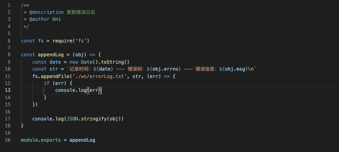 然后通过 Node 中 fs 模块的 appendFile 方法将错误信息传入 errorLog.txt 这个文件,如果没有这个文件是会自动生成的。