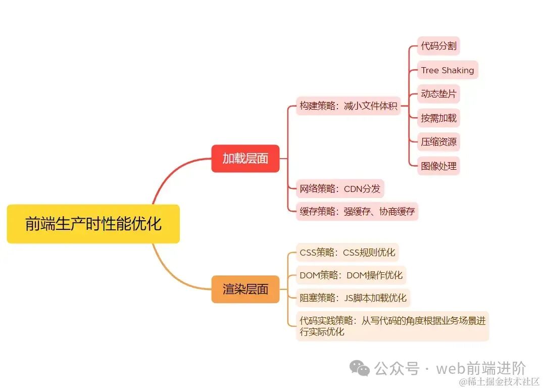 生产时性能我将其分为两个层面。第一,加载层面。第二,渲染层面。(抛出你对性能优化的整体结构划分),加载层面我将其分为以下几个策略:构建、网络、缓存....,渲染层面我将其分为以下几个策略:CSS、DOM、阻塞、代码实践部分.....(同上)