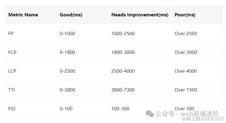 前文提到过,可能部分同学的公司会对性能指标有很详细的要求,要让面试官感受到你完整的性能优化流程,还需要提一提你们的标准(不用全提)。这里由于项目场景、复杂度、技术栈等不同,肯定指标也不能一概而论。在此我给出一个性能表供大家参考,基本和谷歌对其: