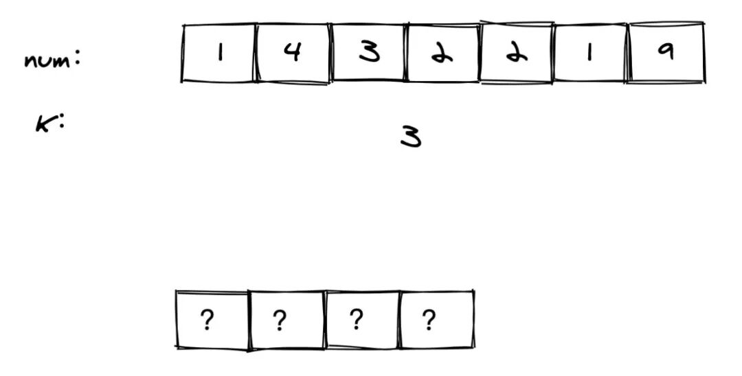 以题目中的 num = 1432219, k = 3 为例,我们需要返回一个长度为 4 的字符串,问题在于:我们怎么才能求出这四个位置依次是什么呢?