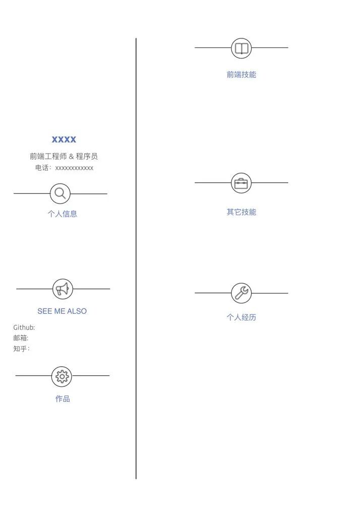 我看很多人写的简历,发现他们写的都很啰嗦,让人一眼看过去抓不住重点,我建议最好把简历精简一下,控制在 1-2 页,写的经历和项目跟你应聘的岗位有强相关,无关的经历就不要写了,写了反而显得啰嗦。像我百用不烂的的模板就像下图这样: