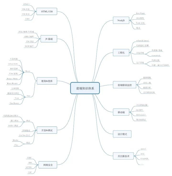 每个岗位都有对应的知识体系,我这里提供一个思路,不管是你在准备面试还是平时技术积累,通过对自己领域的知识梳理,知道自己不足的地方,对自己不熟悉的知识进行查缺补漏。(如果你对整个前端知识体系也不是特别了解,也可以照着我整体的知识体系来进行准备)