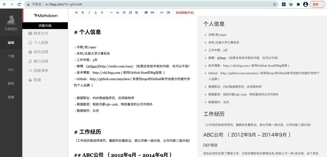 最好用的 MarkDown 在线简历工具,可在线预览、编辑、设置访问密码和生成 PDF