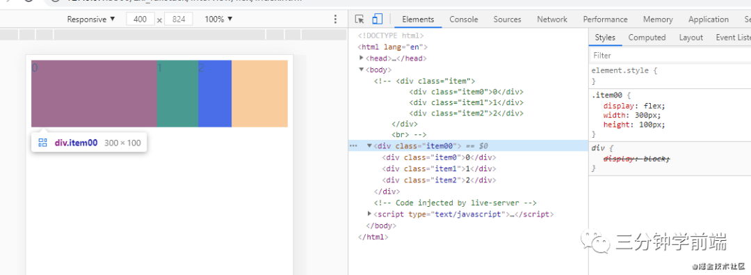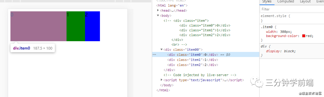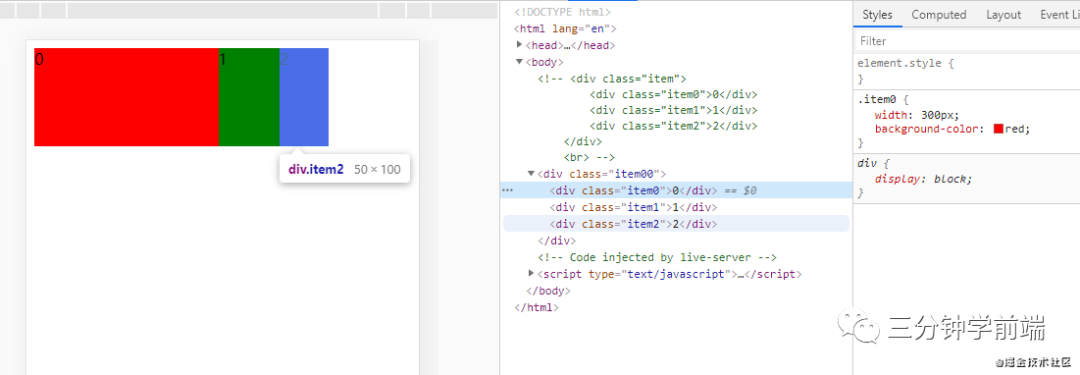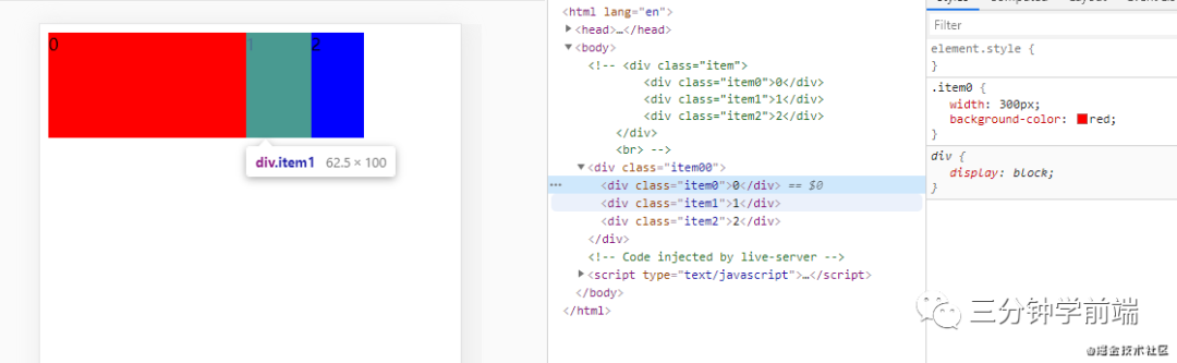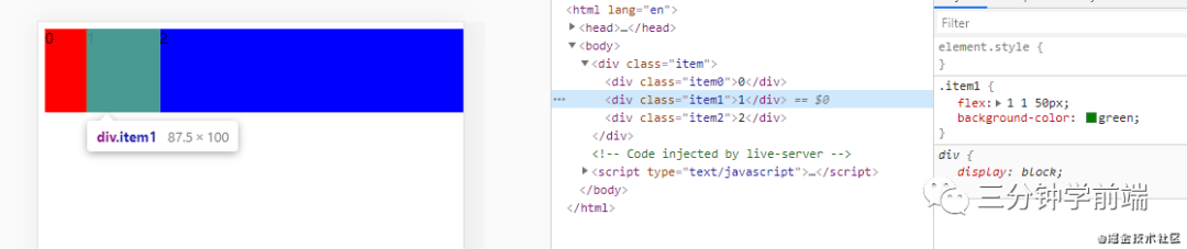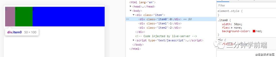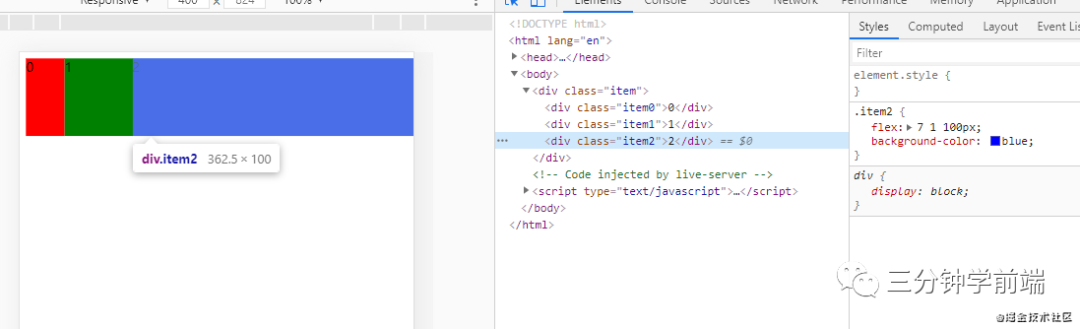 我们在 item 中设置了总得容器宽度为 500px,容器中的 item0、itme1、item2 分别先占有自身的基础宽度,容器中剩余宽度则采用放大比例来进行放大。
